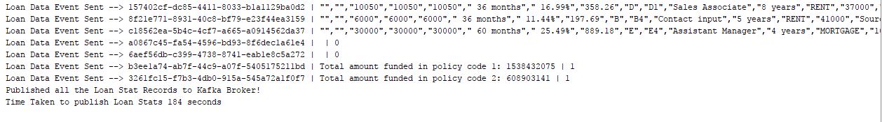 As seem in the image below, it took 184 seconds for the Loan Data Kafka Producer to publish all the loan records.