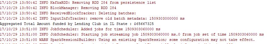 Spark Streaming Job aggregated the total loan amount funded in the IL state. This amount is exactly the same as what we calculated by running the Spark Streaming job in isolation without integration with Kafka and Storm.