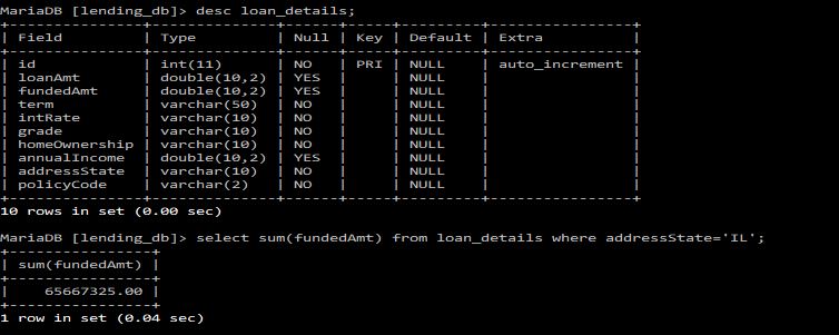 Finally after all the data is processed and written to the database, we run a SQL query to find the total funded amount in IL state that matches exactly with the amount we calculated by running the Spark streaming application.
