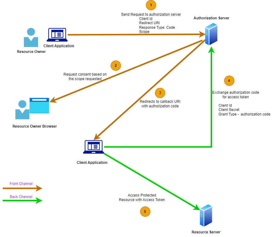 The request from the client application and the redirects using the callback URI in the authorization code flow happens over the front channel. There is a possibility that an attacker can get hold of the authorization code (on the front channel) which then can be misused by the attacker to get access to protected resources. This is mitigated by having the client application exchange authorization code for access token on the back channel. Since the access token is obtained on the back channel, it’s considered to be safe for granting access to protected resources. This explains why an extra step is needed to get the access token in exchange of authorization code. The authorization flow grant type utilizes both the front channel and back channel to provide delegated access to client application.